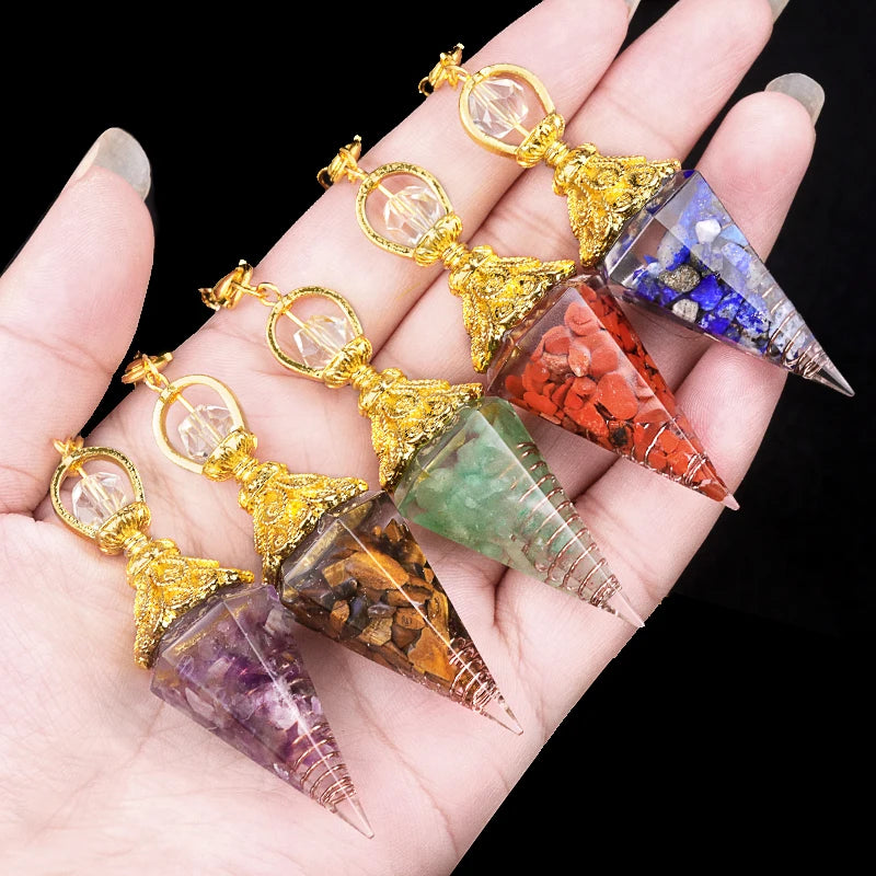 Natural Stone Golden Chain Seven Chakra Spirit Pendulum Gravel Resin Healing Pendant For Jewelry Making Accessories Necklace