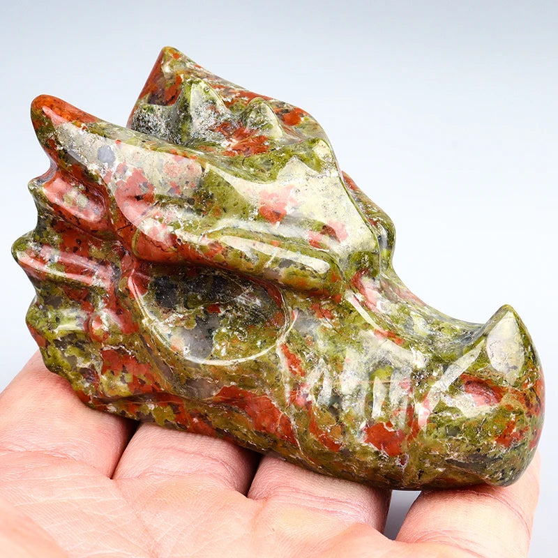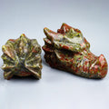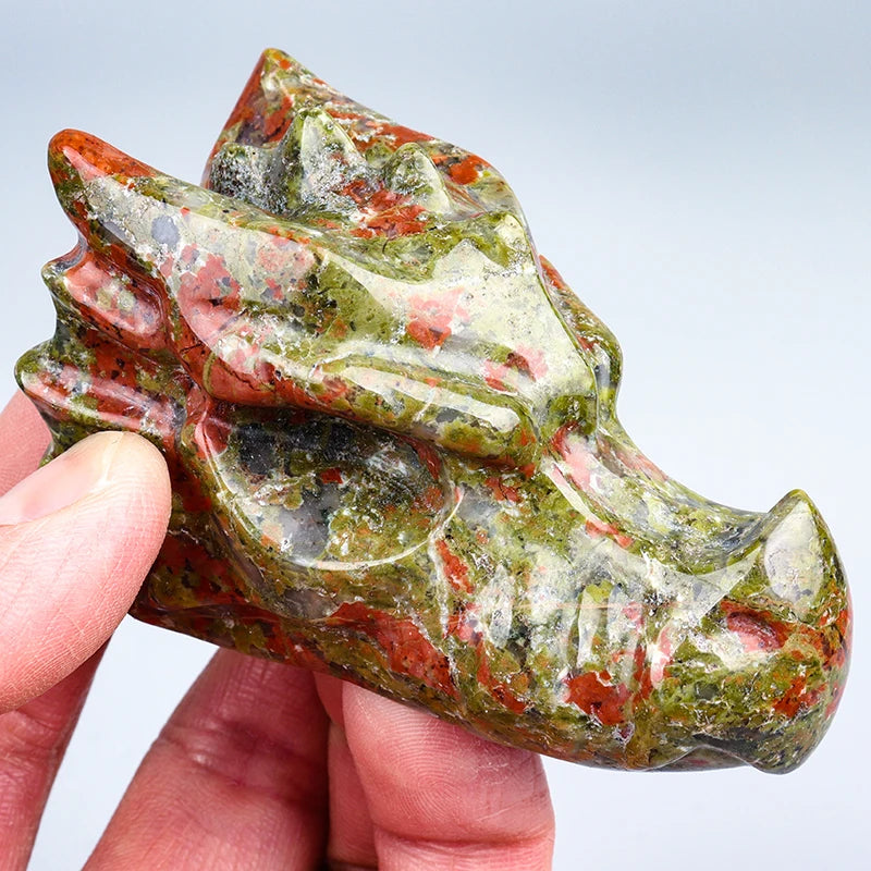 Big Size Natural Unakite Dragon Skulls Figurine, Healing Blue Jade, Hand Craved Animal Statue, Crystal Craft Chakra Decor, 3"