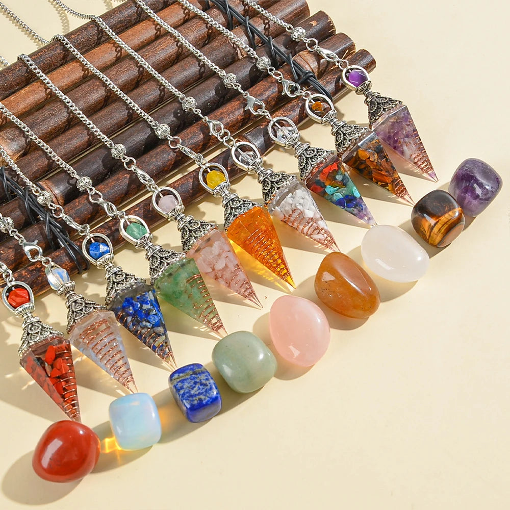 1pc Natural Chakra Healing Crystal Dowsing Pendulum Reiki Stone Chips Orgone Pendulum Pendule Spirituel Tree of Life Jewelry
