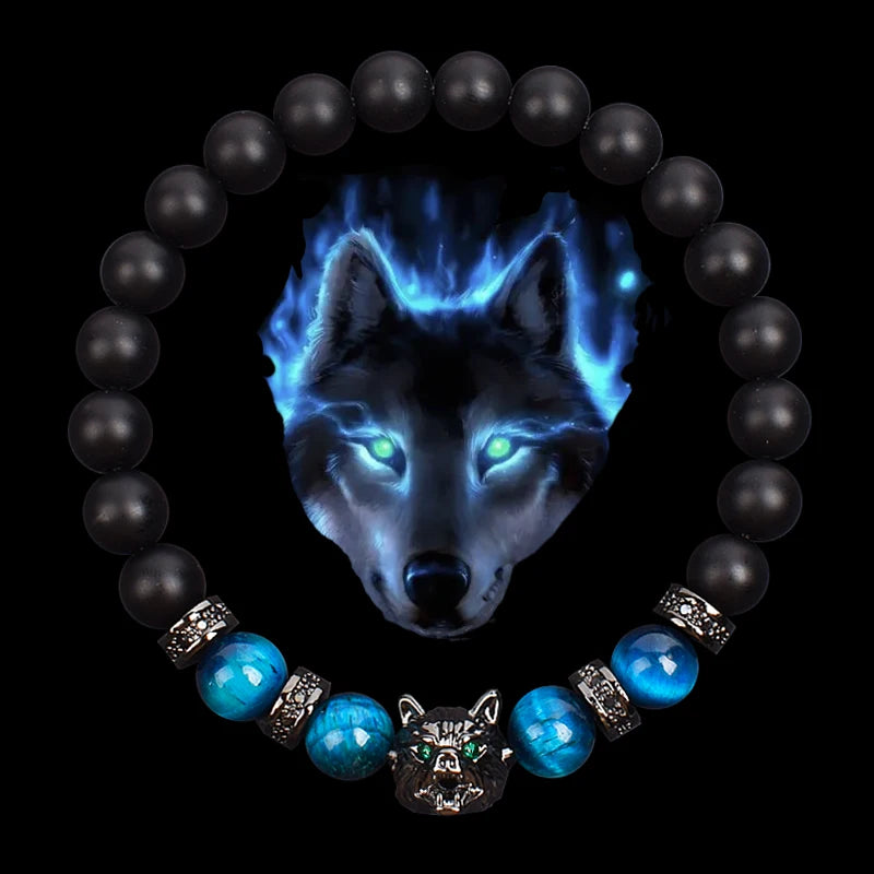 Wolf Charm Bracelets Men Natural Black Agates Onyx Stone Bracelet Brave Blue Tiger Eye Elastic 8 mm Beads Jewelry Beaded Pulsera